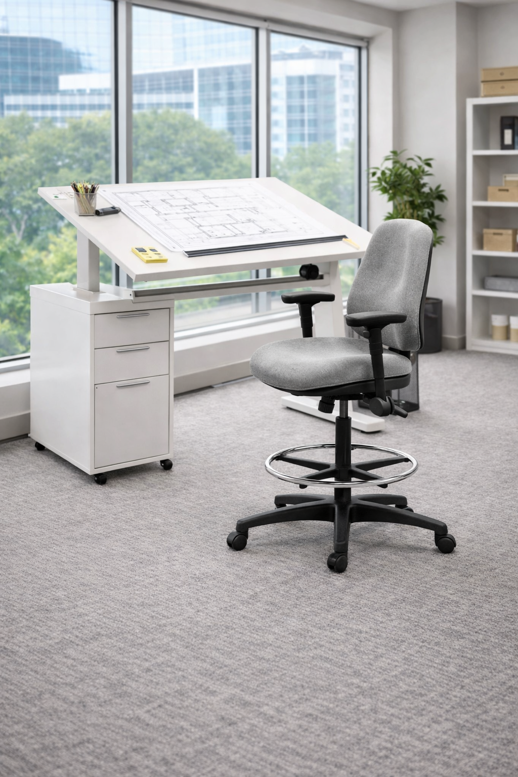 The Finch Drafting Chair is available with two different size backs. It is fully upholstered for comfort and to aid with acoustics within the workplace.