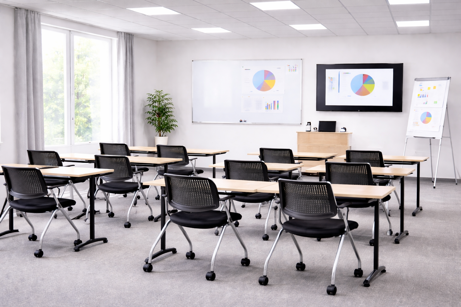 A 4-leg visitor chair on castors with folding seat which makes nesting seats a possibility. Ideal for conference / training areas.