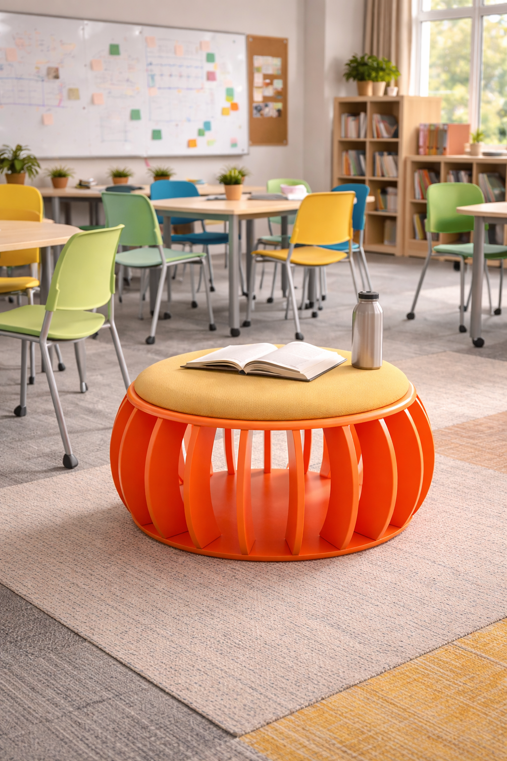 The Keily Ottoman 1 is a multipurpose unit that can be used as a seat or table. The space between spokes can store books or A4 sized files. The option for customisable upholstery and shell colour means the it can be suited for any education setting.