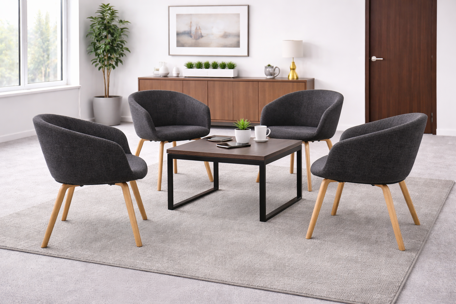 The Mobili Meeting Chair 1 is a wide PP tub chair on natural timber legs. A fully upholstered seat option in customisable fabrics is also available if required.